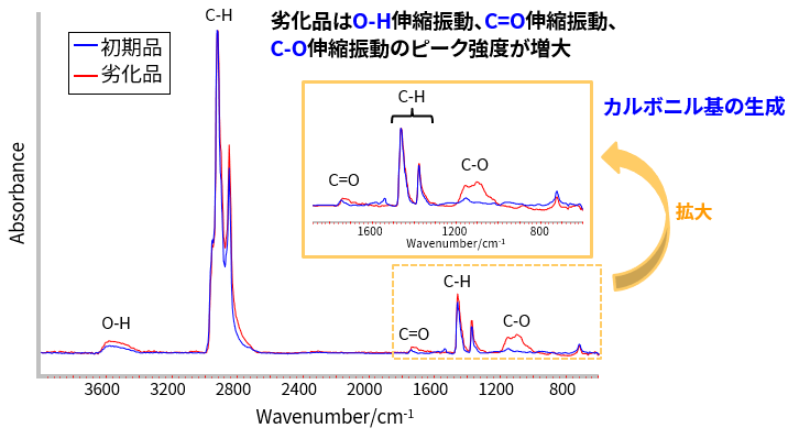 劣化により、ジエンが酸化されカルボニル基が生成したと考えられます。