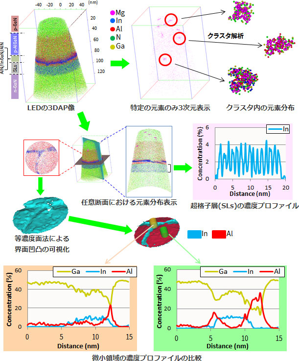 3DAP(3次元アトムプローブ)は、微小領域において原子レベルの空間分解能と高い検出感度を有し、得られたデータから任意領域の抽出・解析を行うことで、鉄鋼などの結晶粒界における微量元素の分布や、半導体などの薄膜積層膜の界面評価などに適した分析手法です。
